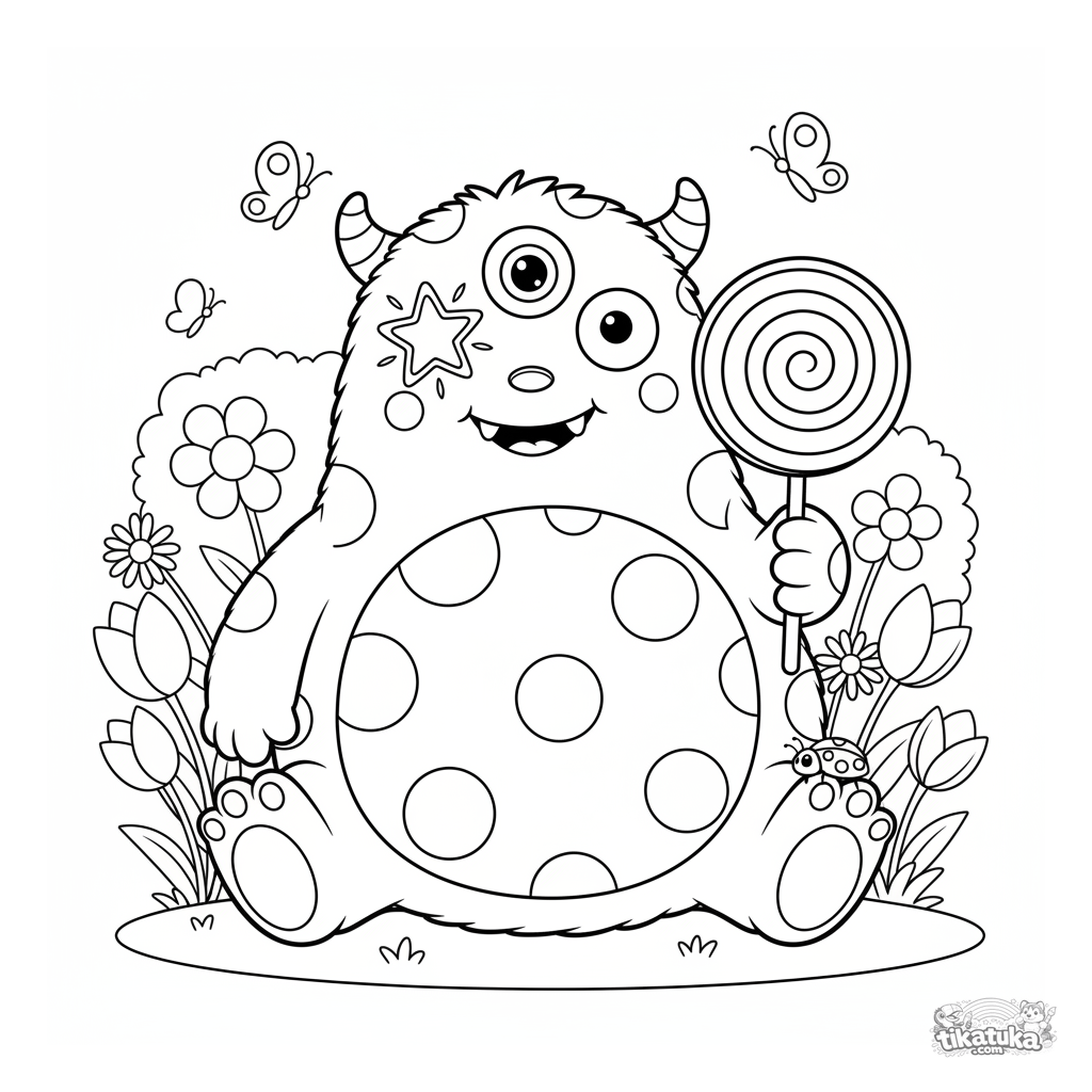 Ausmalbild für Kinder: Ein flauschiges Monster mit drei verschiedenen Augen hält einen Lolli in einem Blumengarten. Eine lustige, bunte Szene mit einem Marienkäfer.