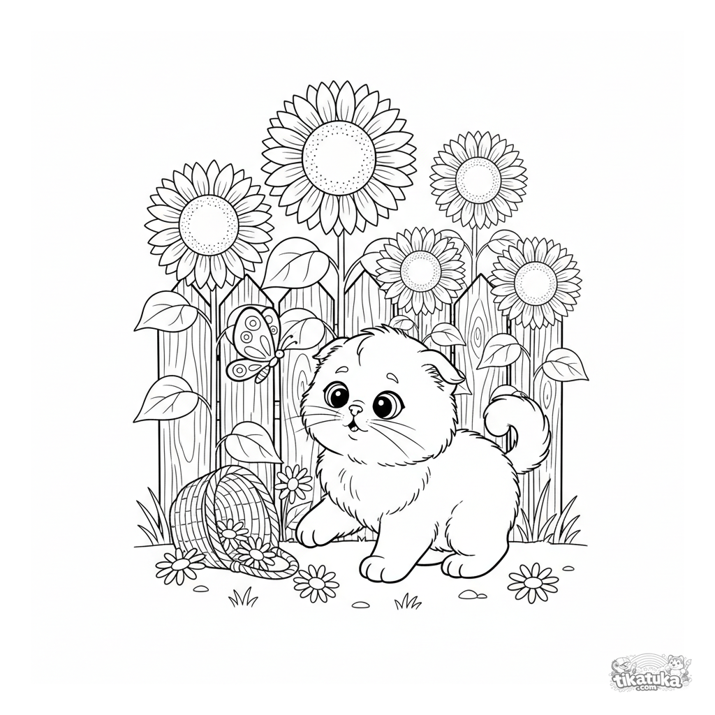 Ausmalbild eines flauschigen Kätzchens, das einen Schmetterling zwischen riesigen Sonnenblumen jagt. Für Kinder von 3-6 Jahren. Eine niedliche Gartenszene.