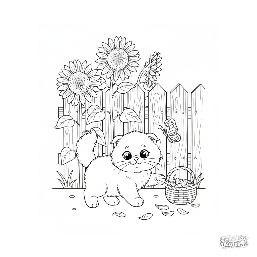 Ausmalbild für Kinder von 4-6 Jahren: Ein flauschiges Kätzchen mit geknickten Ohren jagt verspielt einen Schmetterling zwischen hohen Sonnenblumen.