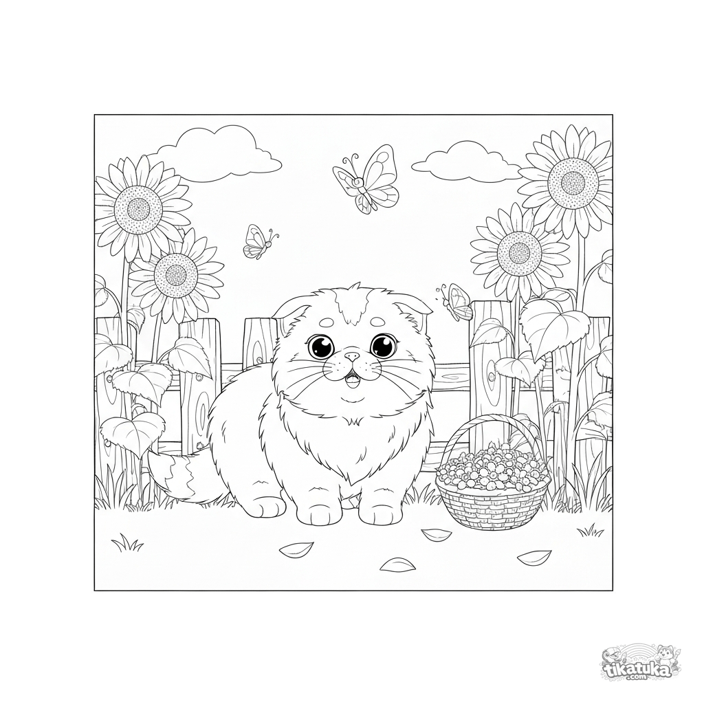 Ausmalbild eines flauschigen Kätzchens, das einen Schmetterling zwischen Sonnenblumen jagt. Für Kinder von 3-6 Jahren. Niedliche Gartenszene.