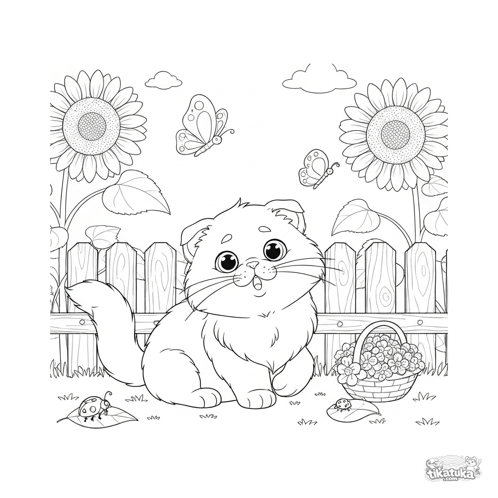 Ausmalbild eines flauschigen Kätzchens, das einem Schmetterling im Sonnenblumengarten nachjagt. Für Kinder von 3 bis 6 Jahren.