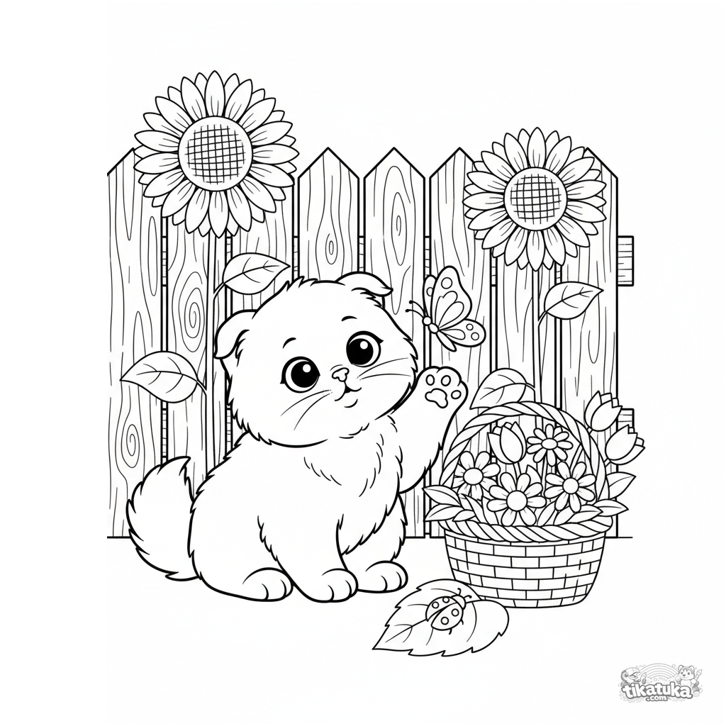 Ausmalbild eines flauschigen Kätzchens im Garten. Für Kinder von 3-6 Jahren. Das Kätzchen spielt neugierig mit einem Schmetterling zwischen riesigen Sonnenblumen.