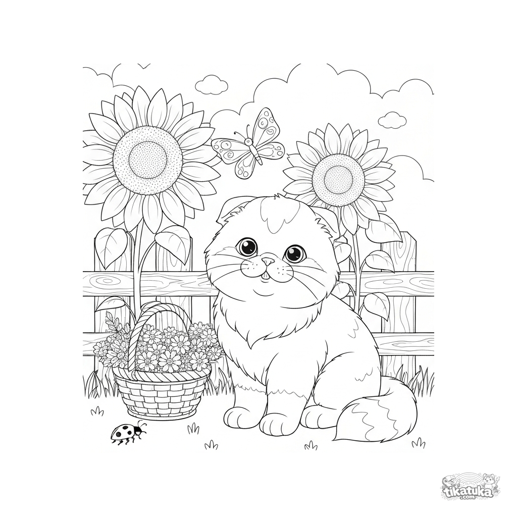 Ausmalbild eines flauschigen Kätzchens in einem Garten zwischen riesigen Sonnenblumen. Für Kinder von 3-6 Jahren. Das Kätzchen schaut überrascht einen Schmetterling an, mit einem Blumenkorb in der Nähe.