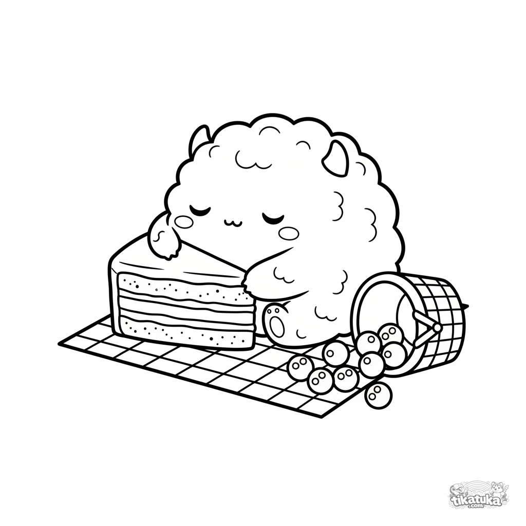 Einfaches Ausmalbild für Kleinkinder: Ein flauschiges Monster schläft auf einem Picknick und nutzt einen Kuchen als Kissen. Große Formen, breite Ränder.