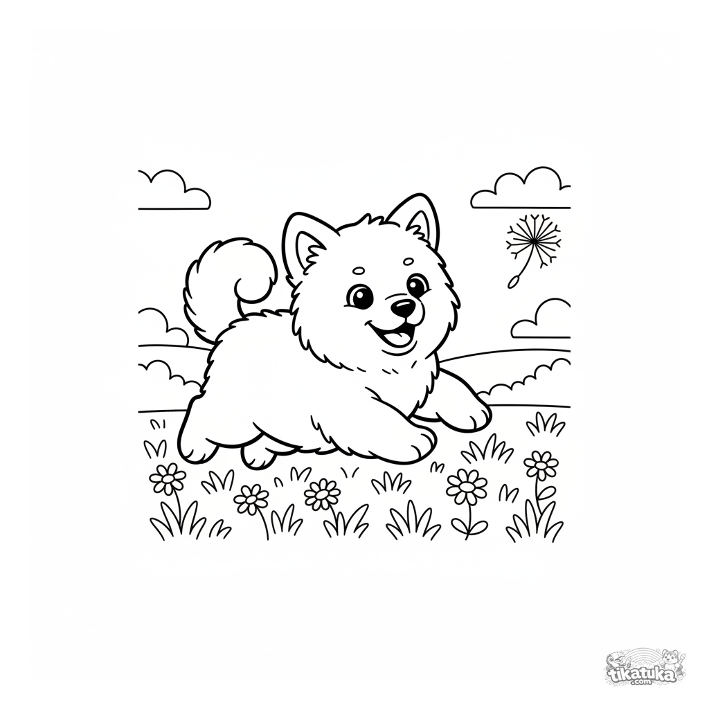 Ausmalbild für Kinder 4-6: Ein flauschiger Samojede-Welpe hüpft fröhlich auf einer Wiese und jagt ein Löwenzahnsamen. Einfache Formen und niedliche Szene.