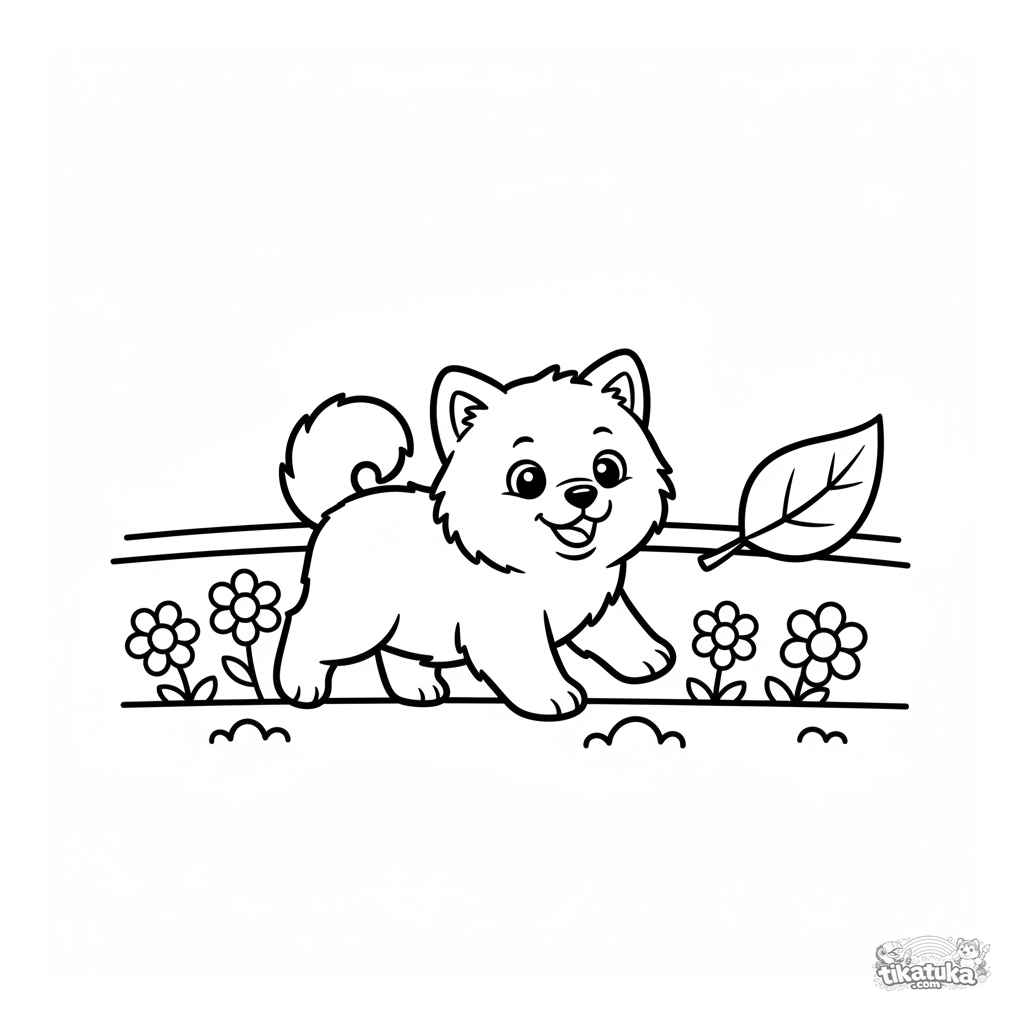 Ausmalbild für Kleinkinder: Ein flauschiger Samojede-Welpe jagt ein Blatt auf einer Wiese. Einfache, große Formen.