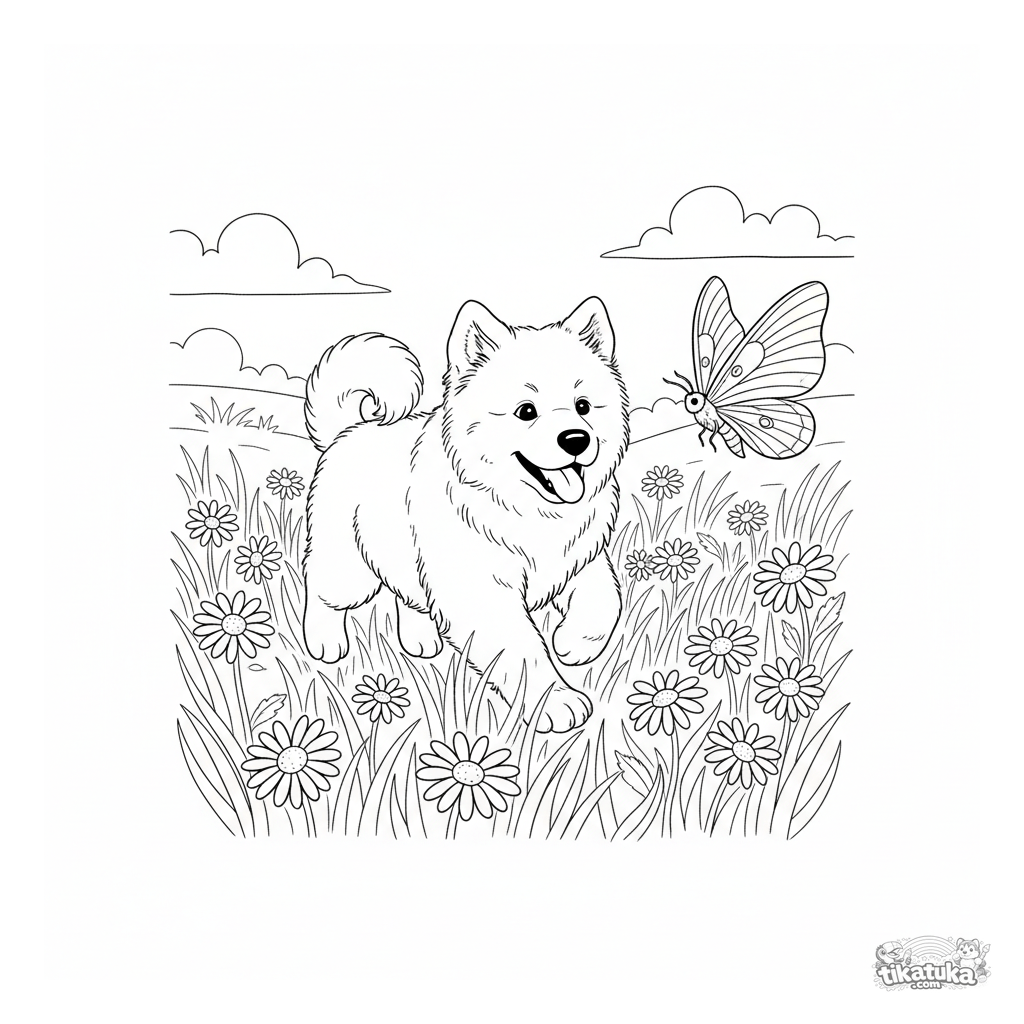 Ausmalbild eines flauschigen Samojede-Welpen, der glücklich einer Motte auf einer Sommerwiese nachjagt. Für Kinder von 4 bis 6 Jahren.