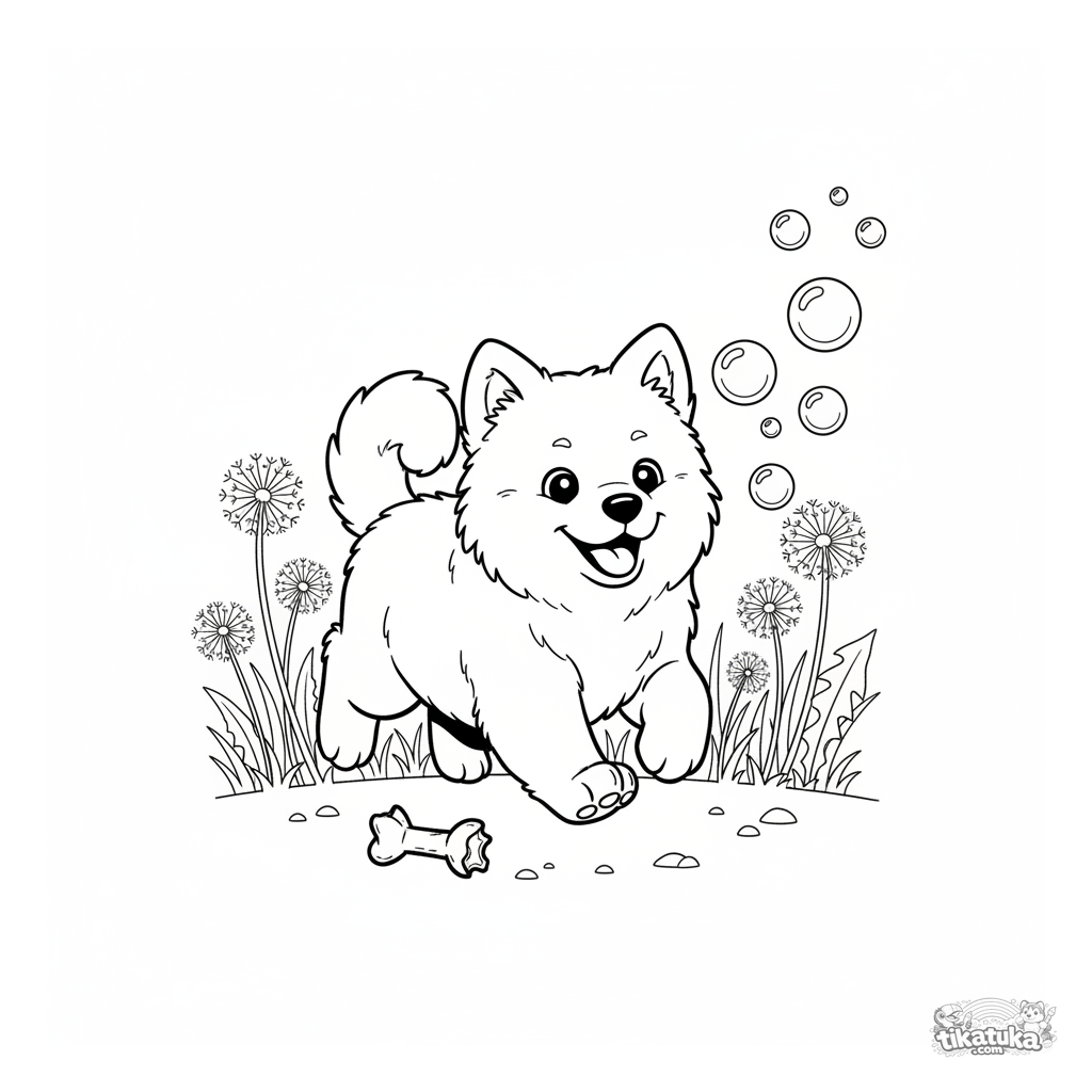 Ausmalbild eines flauschigen Samojede-Welpen, der fröhlich Seifenblasen auf einer Löwenzahnwiese jagt. Für Kinder von 3-6 Jahren.