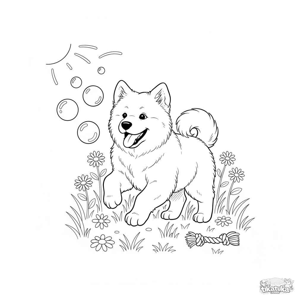 Ausmalbild eines flauschigen Samojeden-Welpen, der fröhlich Seifenblasen auf einer Wiese jagt. Für Kinder von 3 bis 6 Jahren.