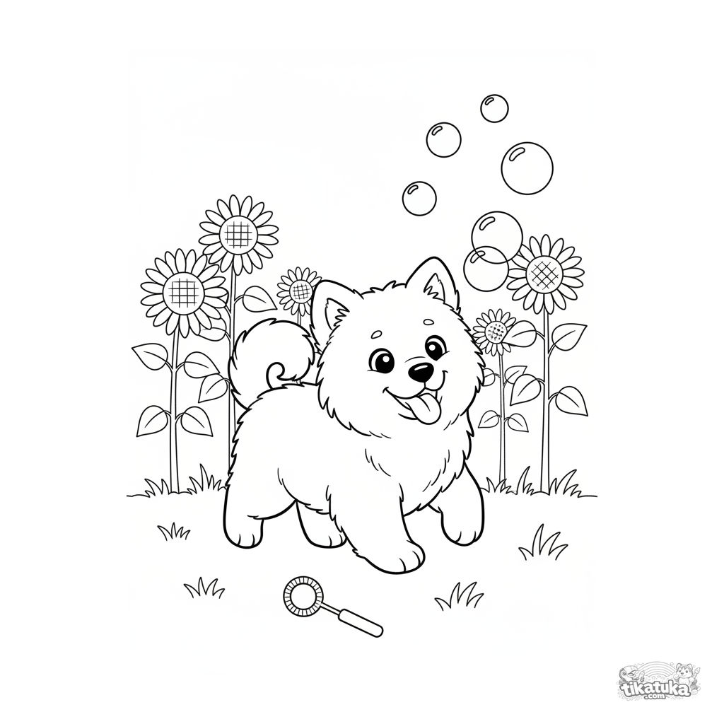 Ausmalbild für Kinder: Ein flauschiger Samojeden-Welpe jagt fröhlich Seifenblasen auf einem Sonnenblumenfeld. Für 5-7 Jahre.