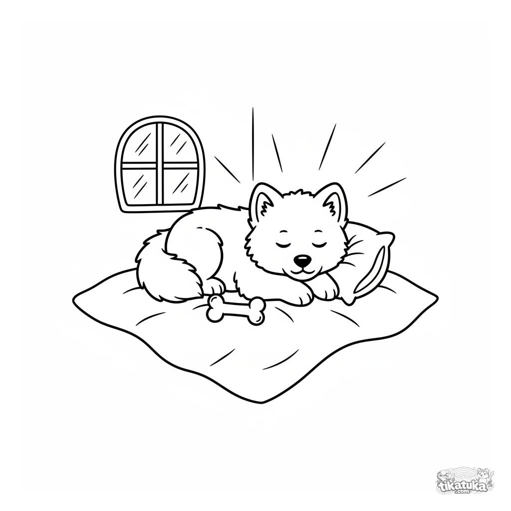 Ausmalbild für Kleinkinder: Ein flauschiger Samojeden-Welpe schläft fest auf einer gemütlichen Decke. Einfache, große Formen perfekt für Kinder von 2-3 Jahren.