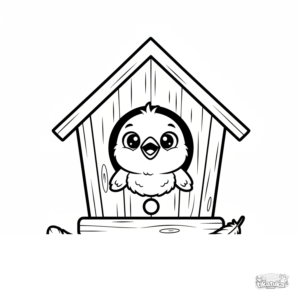 Ausmalbild für Kleinkinder: Ein flauschiges Spatzenküken lugt aus dem runden Fenster eines Holz-Vogelhauses. Einfache große Formen mit breiten Rändern.