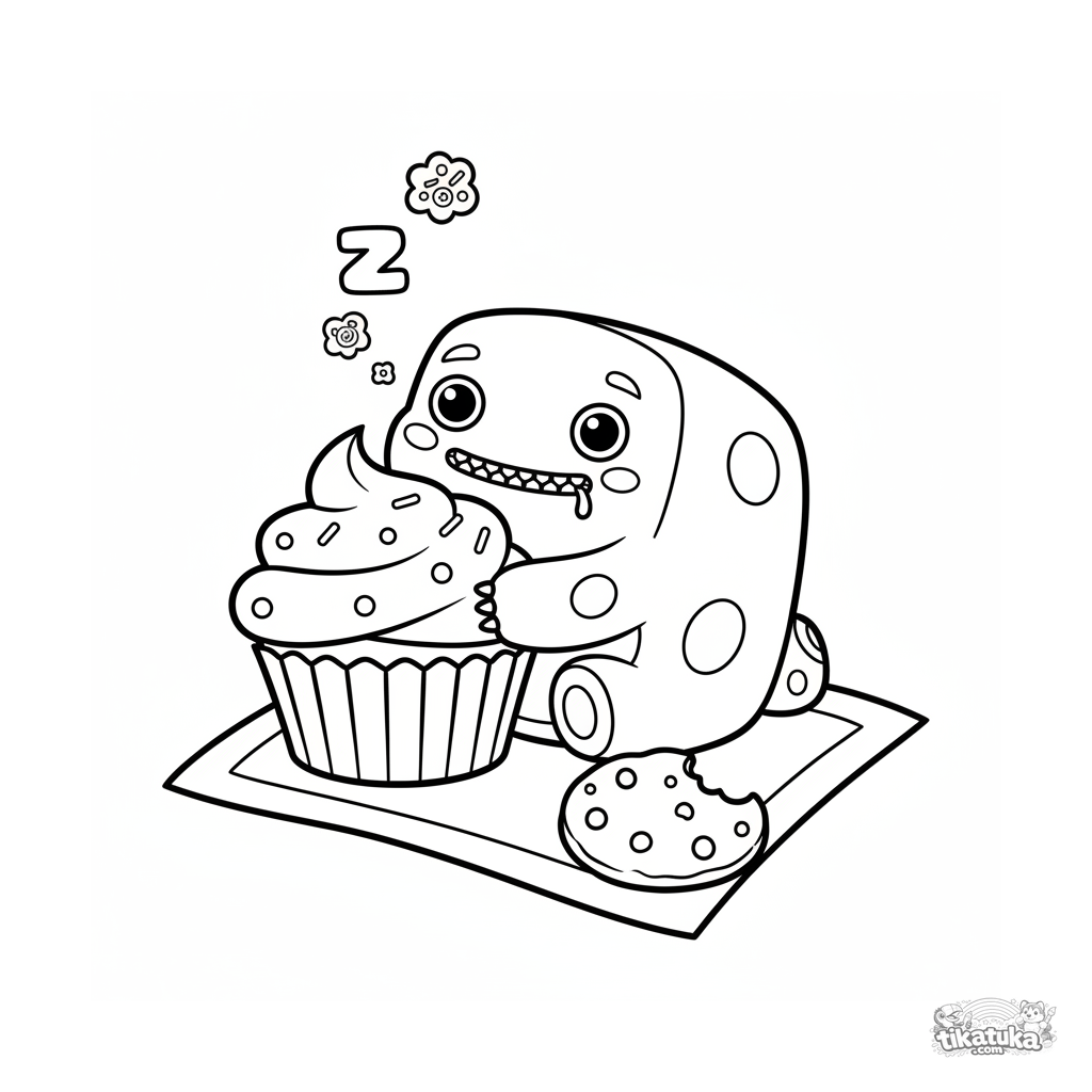 Einfaches Ausmalbild für Kleinkinder: ein quadratisches Plüschmonster schläft auf einem Cupcake-Kissen beim Picknick. Große Formen, wenige Details.