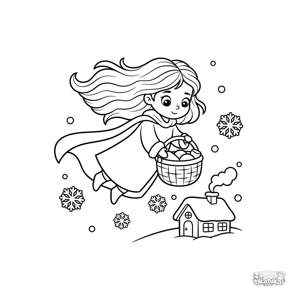 Einfaches Ausmalbild für Kleinkinder 2-3: Ein freundlicher fliegender Superheld mit Flügeln senkt einen Korb zu einem Schneedorf herab. Große Formen.