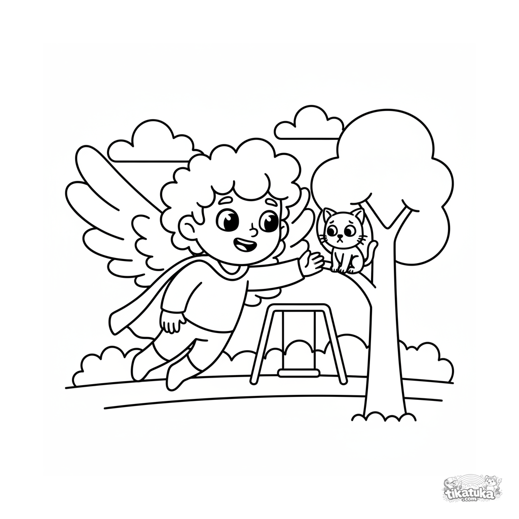 Einfaches Ausmalbild für Kleinkinder 2-3: Ein freundlicher fliegender Superheld mit Flügeln rettet ein Kätzchen, das hoch in einem Parkbaum feststeckt.