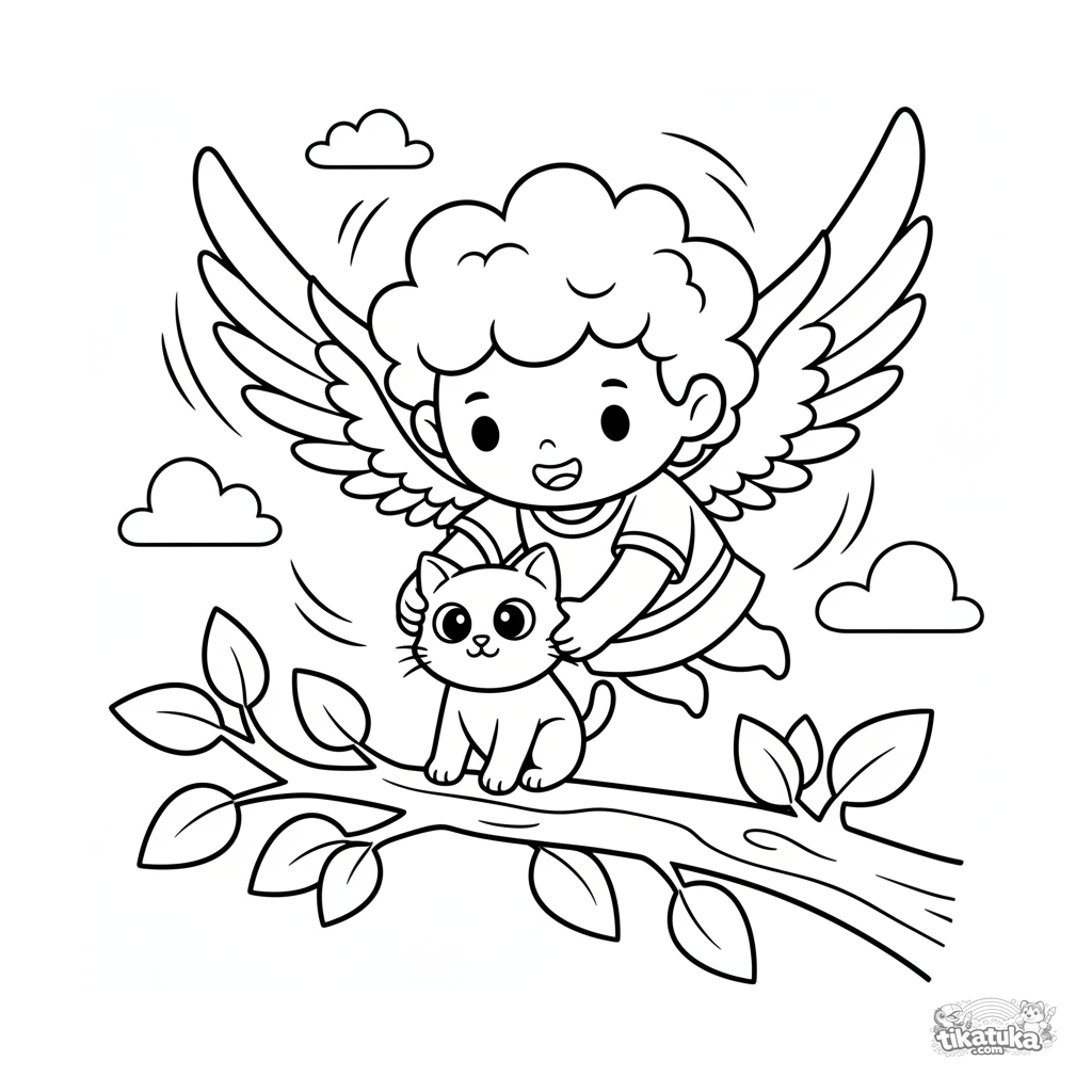 Einfaches Ausmalbild für Kleinkinder 2-3: Ein freundlicher Flugheld mit Federflügeln rettet sanft ein Kätzchen von einem Ast im Park.