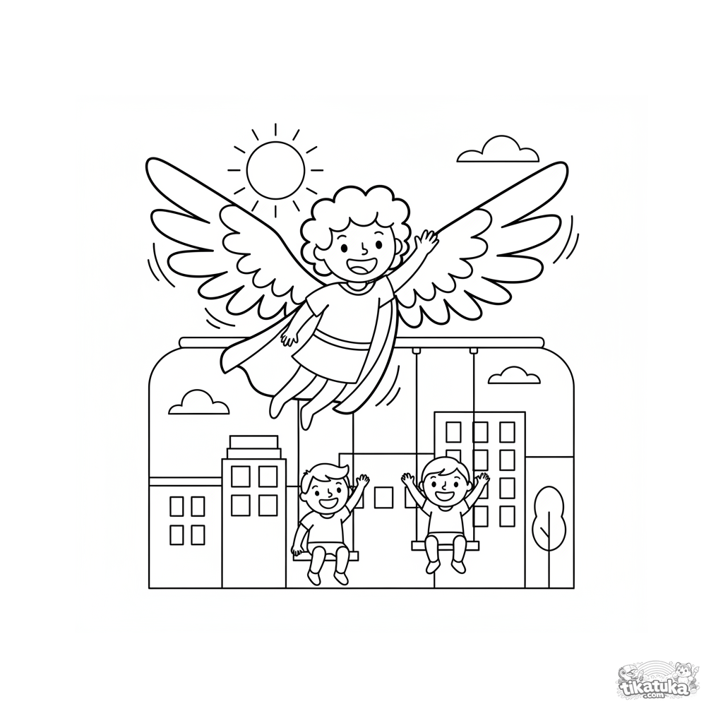 Einfaches Kleinkind-Ausmalbild: Ein fliegender Superheld mit Federnflügeln schwebt über einem Stadtspielplatz. Große Formen, weite Ränder, für Kinder von 2-3 Jahren.