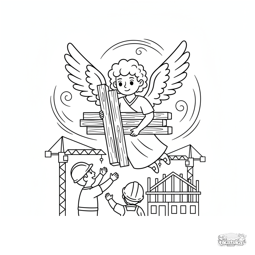 Einfaches Ausmalbild für Kleinkinder 2-3: Ein freundlicher fliegender Held mit großen Flügeln hilft auf einer Baustelle und trägt Balken. Große, klare Formen.