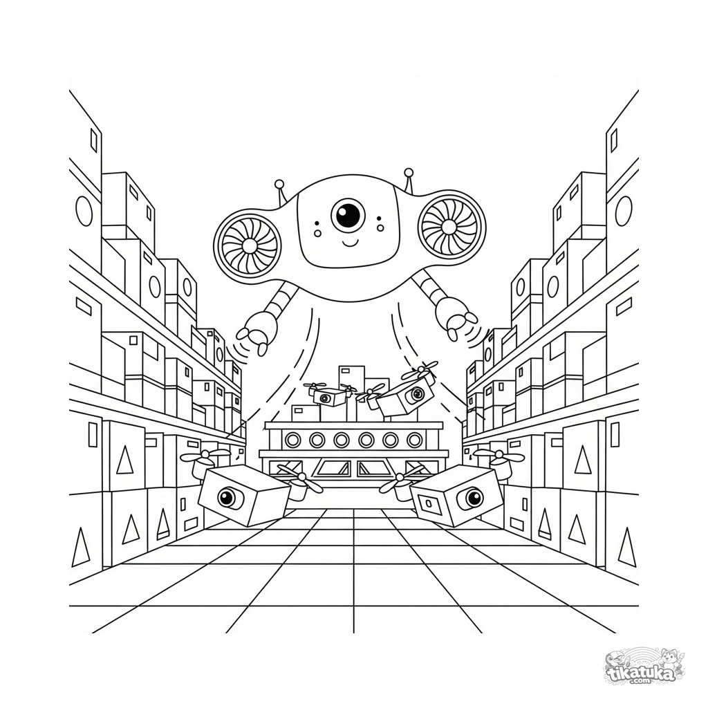 Ausmalbild für Kinder 7-9: Ein fliegender Roboterhirt führt eine Gruppe Drohnen zum Aufladen in einem Lagerhaus. Szene mit Bewegung und Weite.