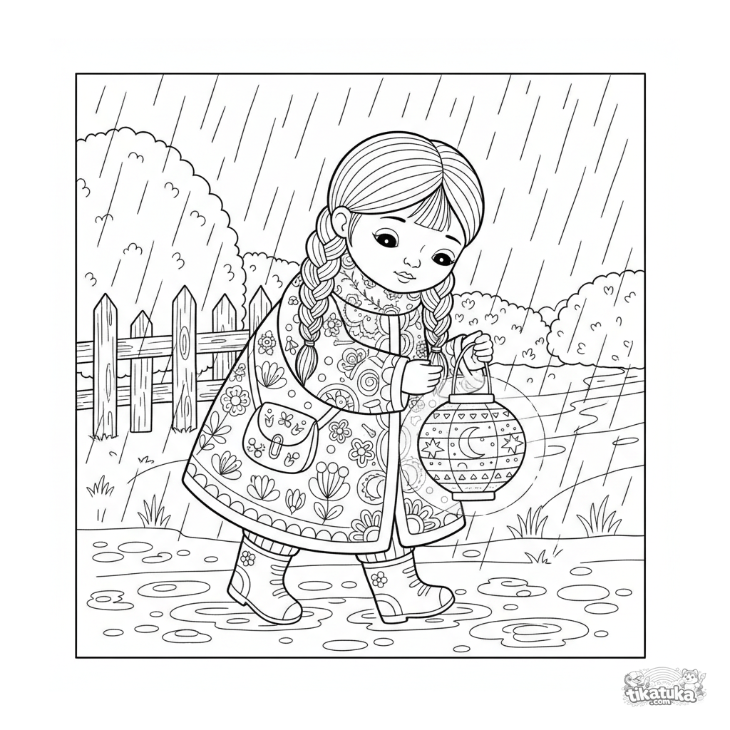 Detailliertes Volkskunst-Ausmalbild für Kinder 10-12: Ein Kind im gemusterten Mantel geht mit Laterne auf einem matschigen Weg im abendlichen Herbstregen.