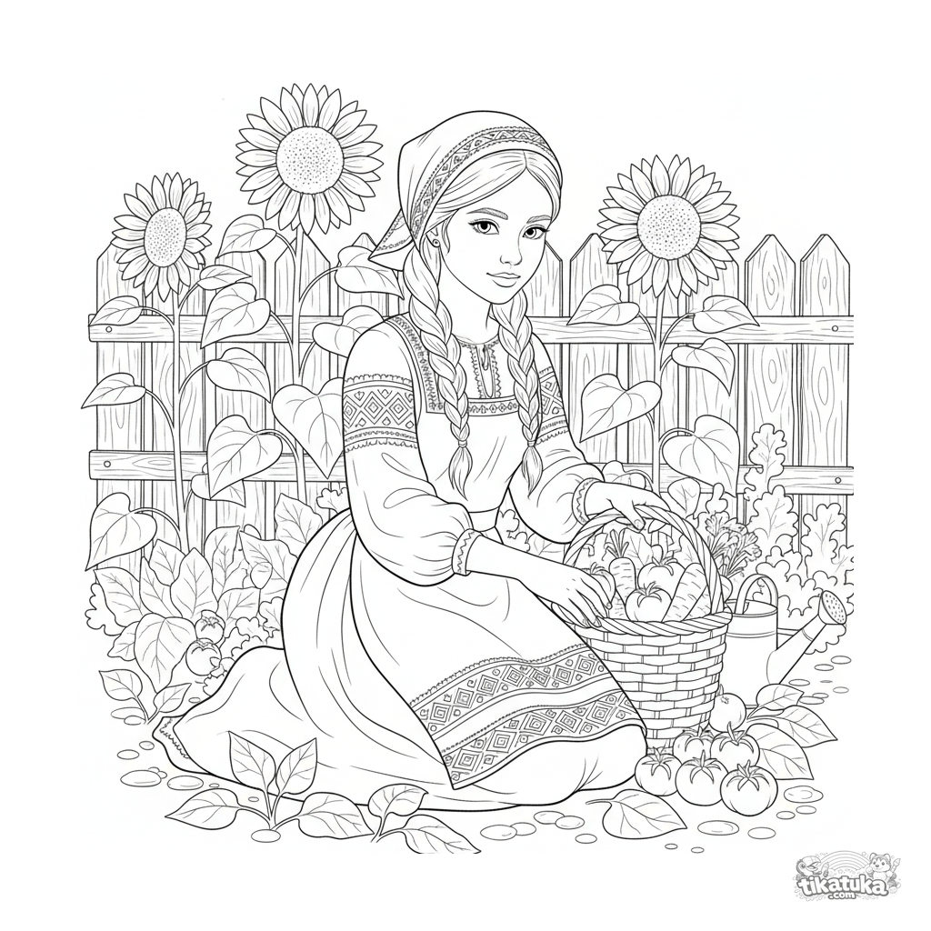 Detailliertes Ausmalbild für 10-12 Jahre: Ein Mädchen in einem Volksstickerei-Schürzenkleid erntet Gemüse im Garten. Komplexe geometrische Muster und naturalistischer Hintergrund.
