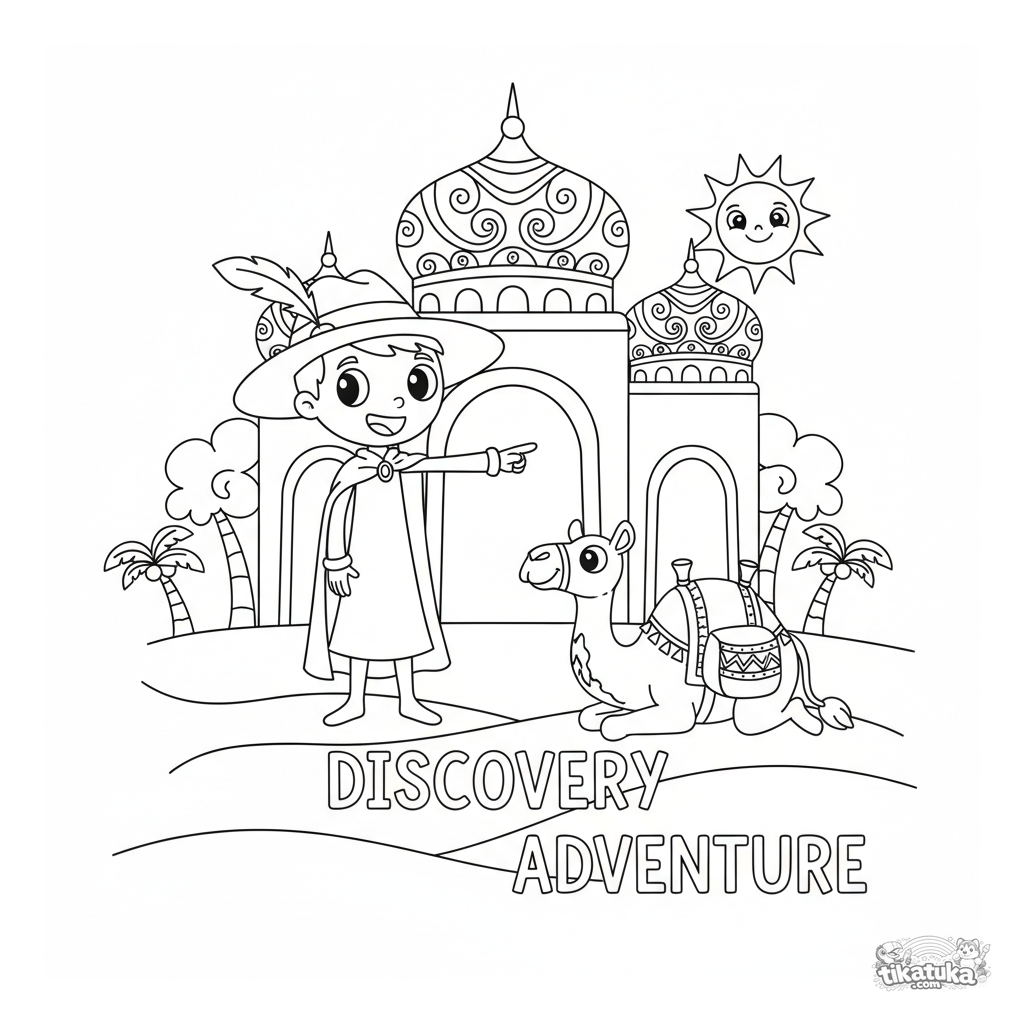 Ausmalbild für Kinder von 4-6 Jahren im Volkskunststil: ein Reisender erkundet einen majestätischen Wüstenpalast. Kräftige Umrisse und charakteristische Details.