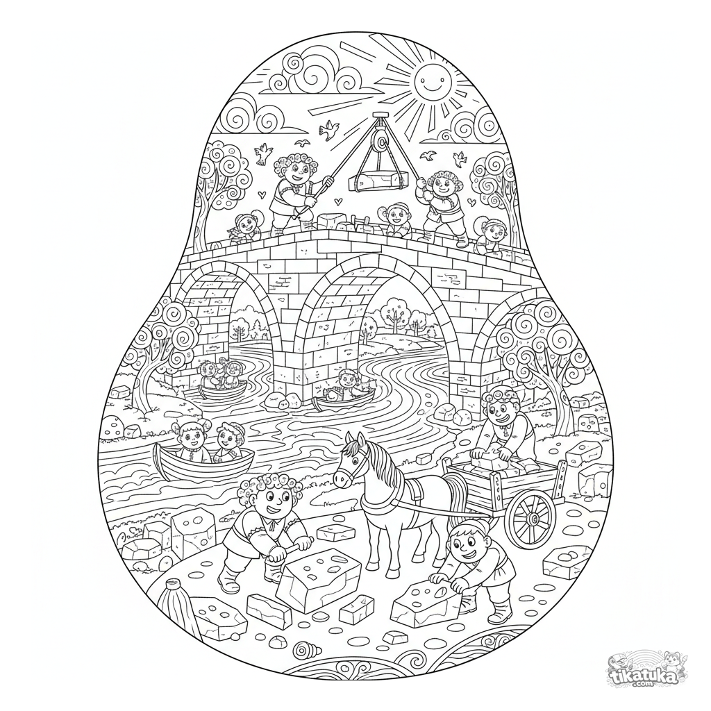 Dynamisches Volkskunst-Ausmalbild von Arbeitern, die eine große Steinbrücke bauen. Für ältere Kinder von 7-12 Jahren. Zeigt Bauarbeiter, Flaschenzüge, Pferde und Boote auf dem Fluss.