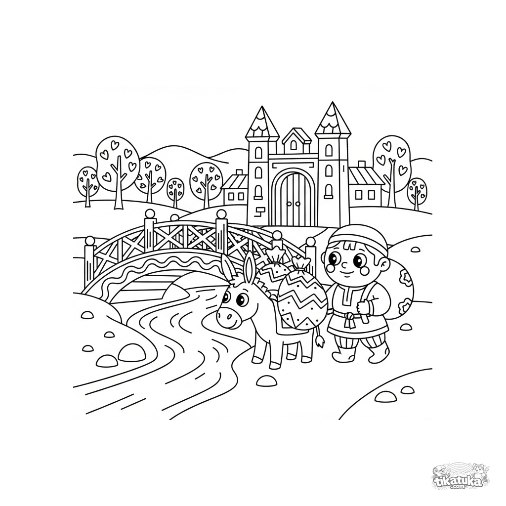 Ausmalbild für Kinder 4-6: eine Holzbrücke über einen Bach, ein Händler mit einem Esel kommt in einem Dorf an. Einfache Formen, klare Linien, breite Ränder.