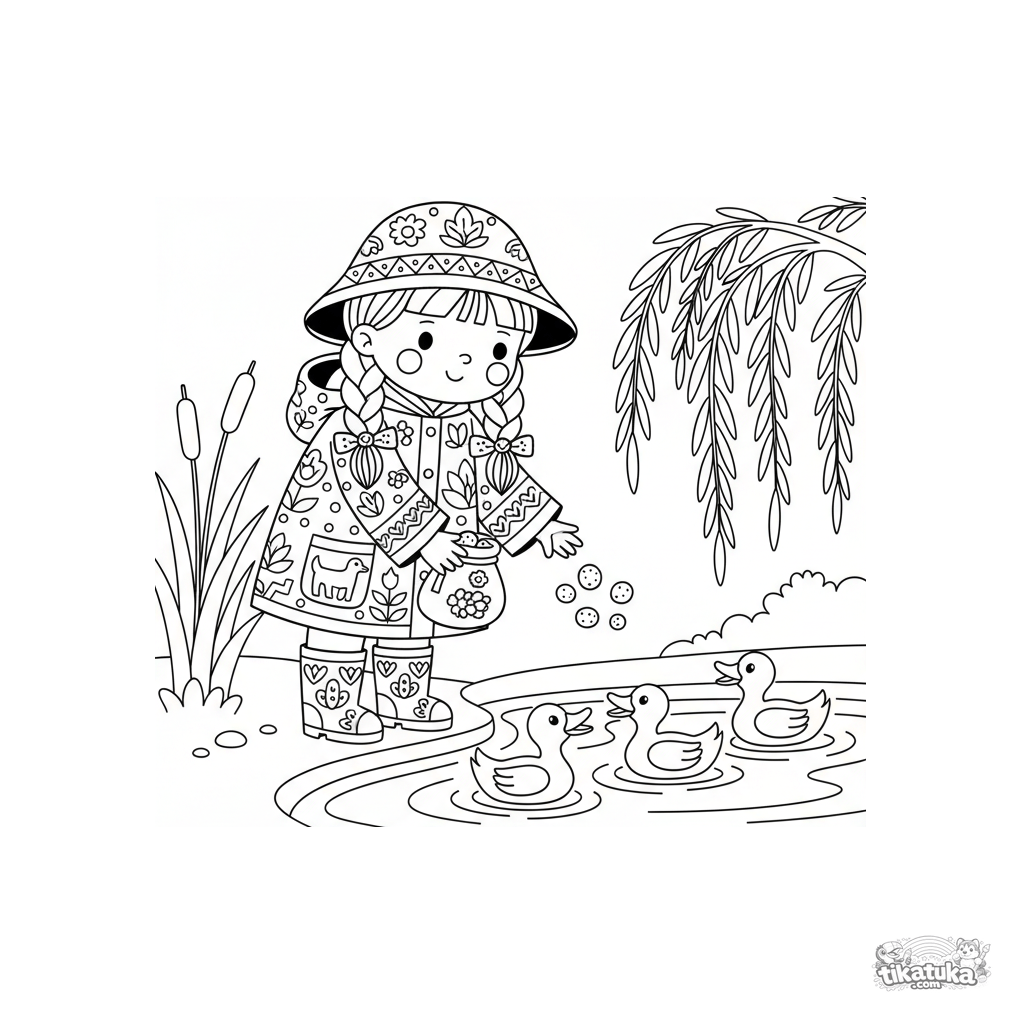 Ausmalbild für Kinder 7-9 im Folk-Stil: ein Kind im gemusterten Regenmantel füttert Enten an einem Herbstteich im Regen.