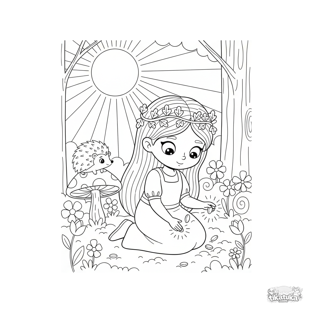 Ausmalbild für Kinder 4-6: Eine Waldprinzessin pflanzt leuchtende Samen in einem mondbeschienenen Garten. Ein neugieriger Igel beobachtet sie.