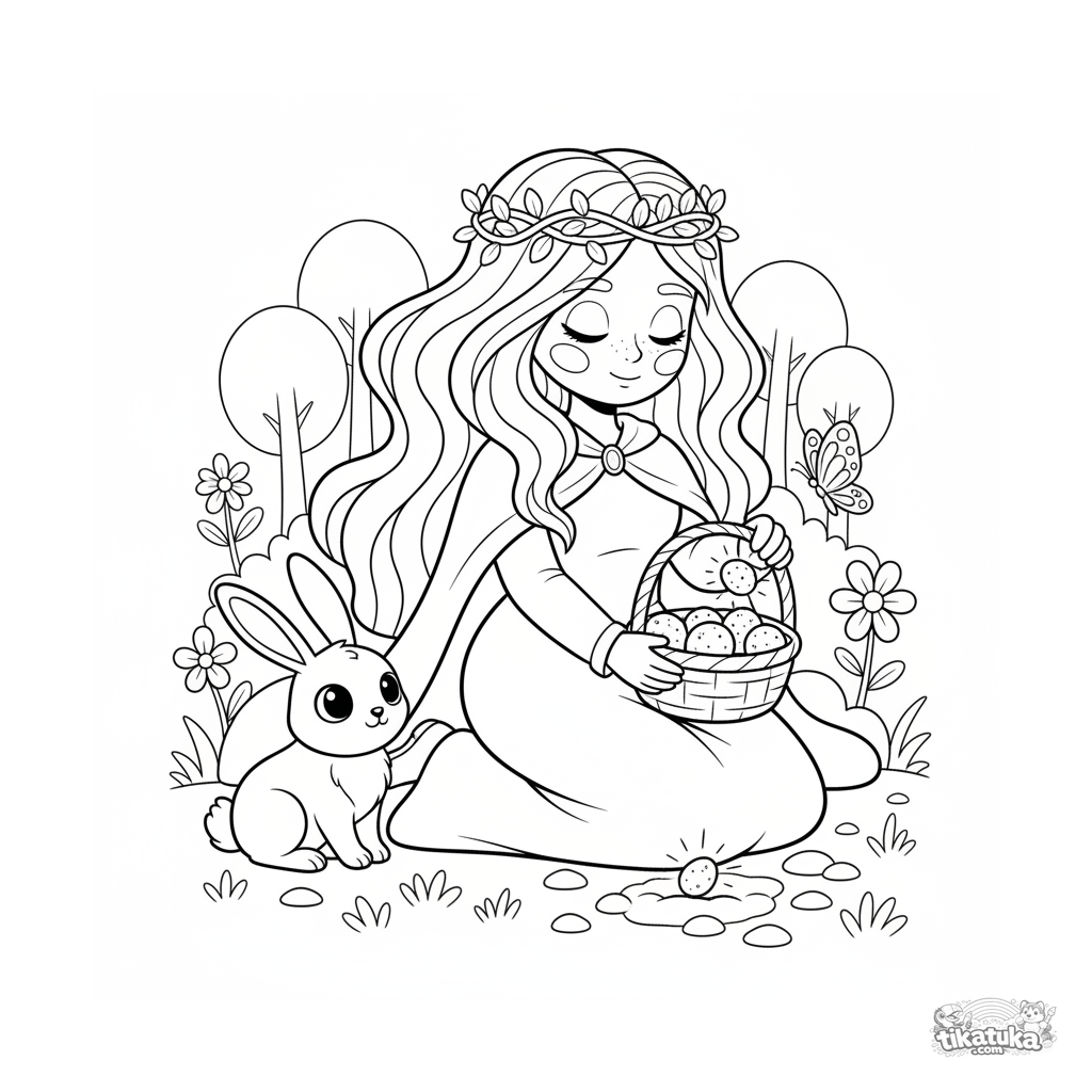 Ausmalbild für Kinder 4-6: eine Waldprinzessin pflanzt magische Samen auf einer Wiese mit einem Hasen und einem Schmetterling.