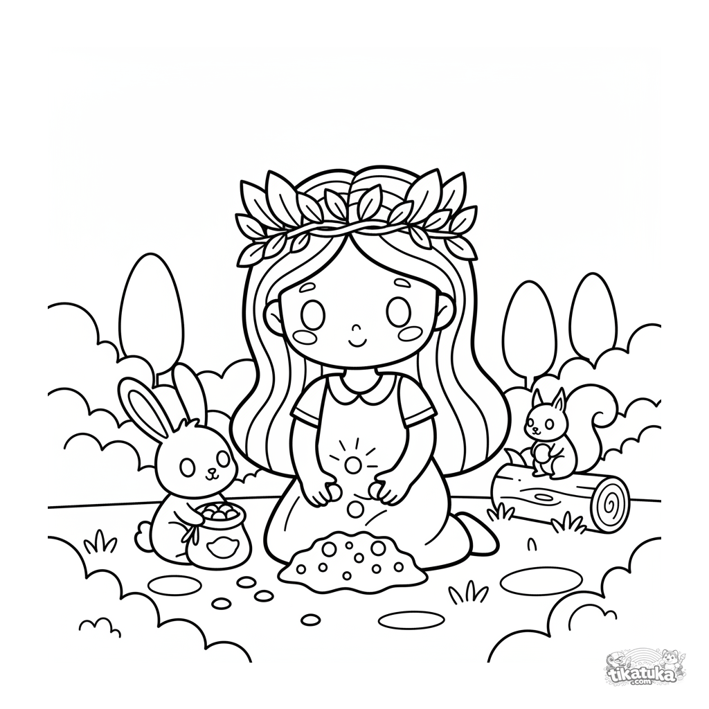 Einfaches Ausmalbild für Kleinkinder 2-3 Jahre: Eine Wald-Prinzessin mit Rankenkrone pflanzt magische Samen auf einer Lichtung.