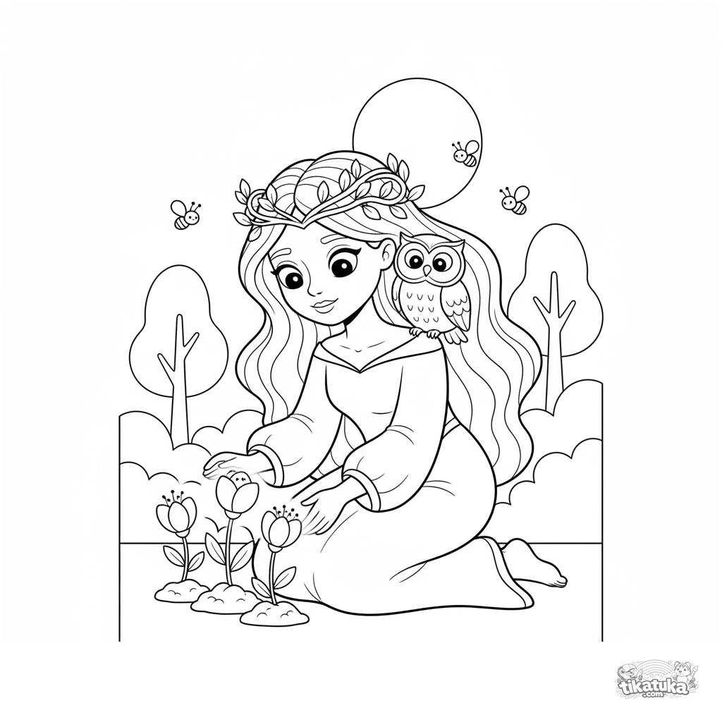 Ausmalbild für Kinder 4-6: Eine Waldprinzessin pflanzt magische Blumen im Mondlicht, mit einer Eule und Glühwürmchen. Eine süße, friedliche Szene zum Ausmalen.