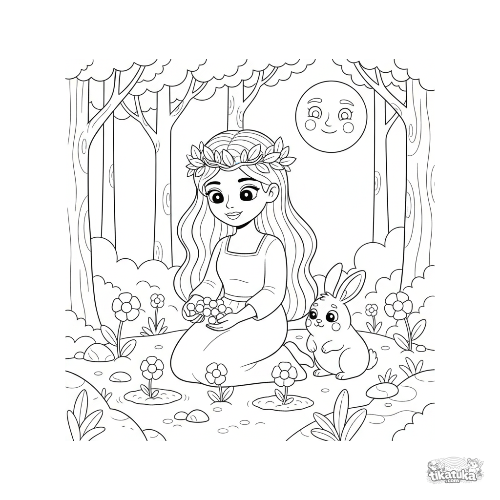 Ausmalbild für Kinder 4-6: Eine Waldprinzessin pflanzt magische Blumen im Mondlicht mit einem Hasen. Süße Szene in einem verzauberten Garten.