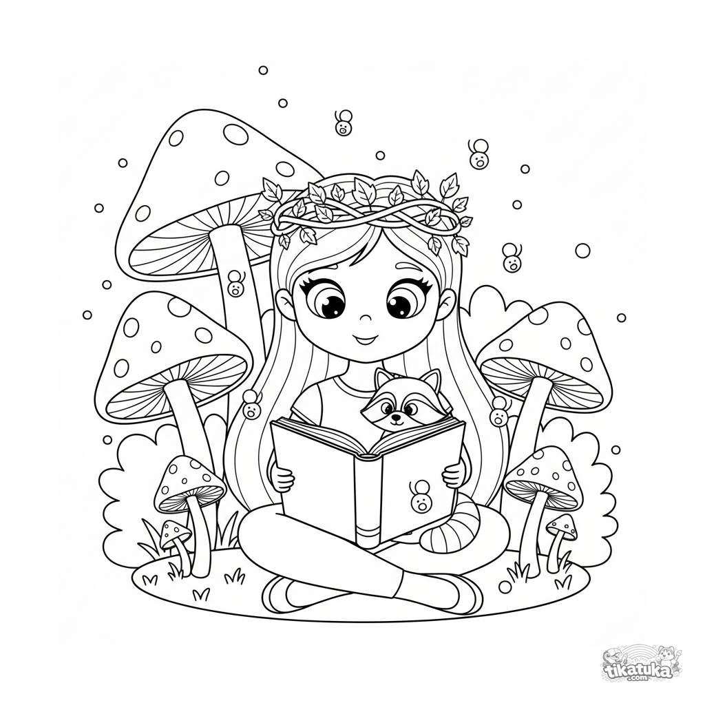 Ausmalbild für Kinder 4-6: Eine Waldprinzessin liest einem Waschbären in einem Kreis leuchtender Pilze ein Buch vor. Blätter im Haar, schwebende Glühwürmchen.