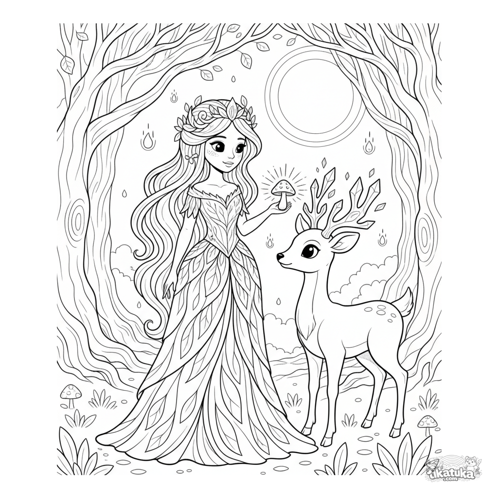 Ausmalbild für Kinder 7-9: Eine Waldprinzessin in einem mondbeschienenen Hain freundet sich mit einem magischen leuchtenden Hirsch an. Eine friedvolle Szene.