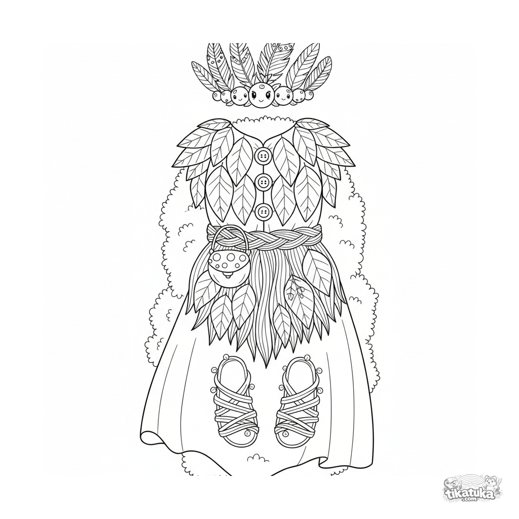 Detailliertes Ausmalbild für Mädchen 10-12: Ein Flatlay eines magischen Wald-Outfits aus Blättern, Eicheln und Pilzen auf weichem Moos.