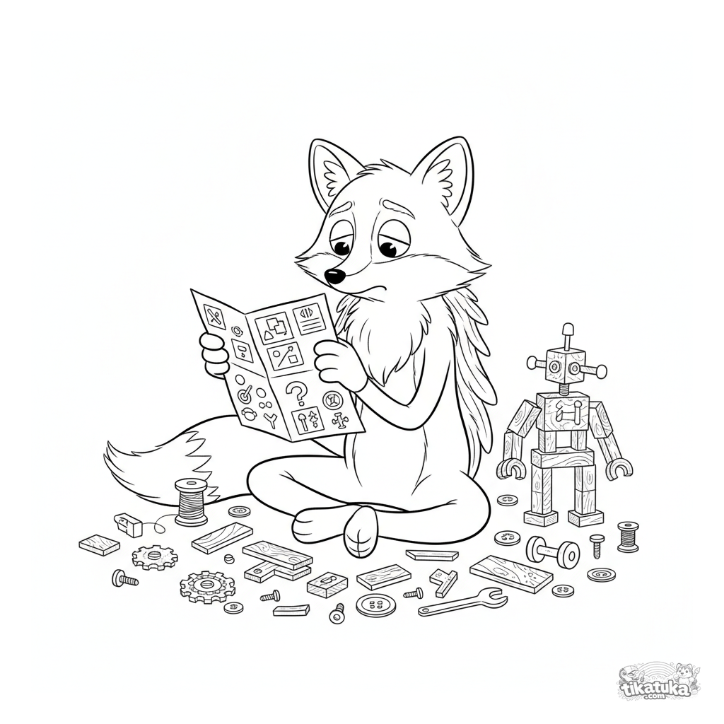 Ausmalbild für Kinder von 7 bis 12 Jahren: Ein Fuchs sieht völlig verwirrt auf ein kryptisches Montageanleitungsblatt, während er zwischen verstreuten Teilen sitzt. Chaotische und lustige Szene.