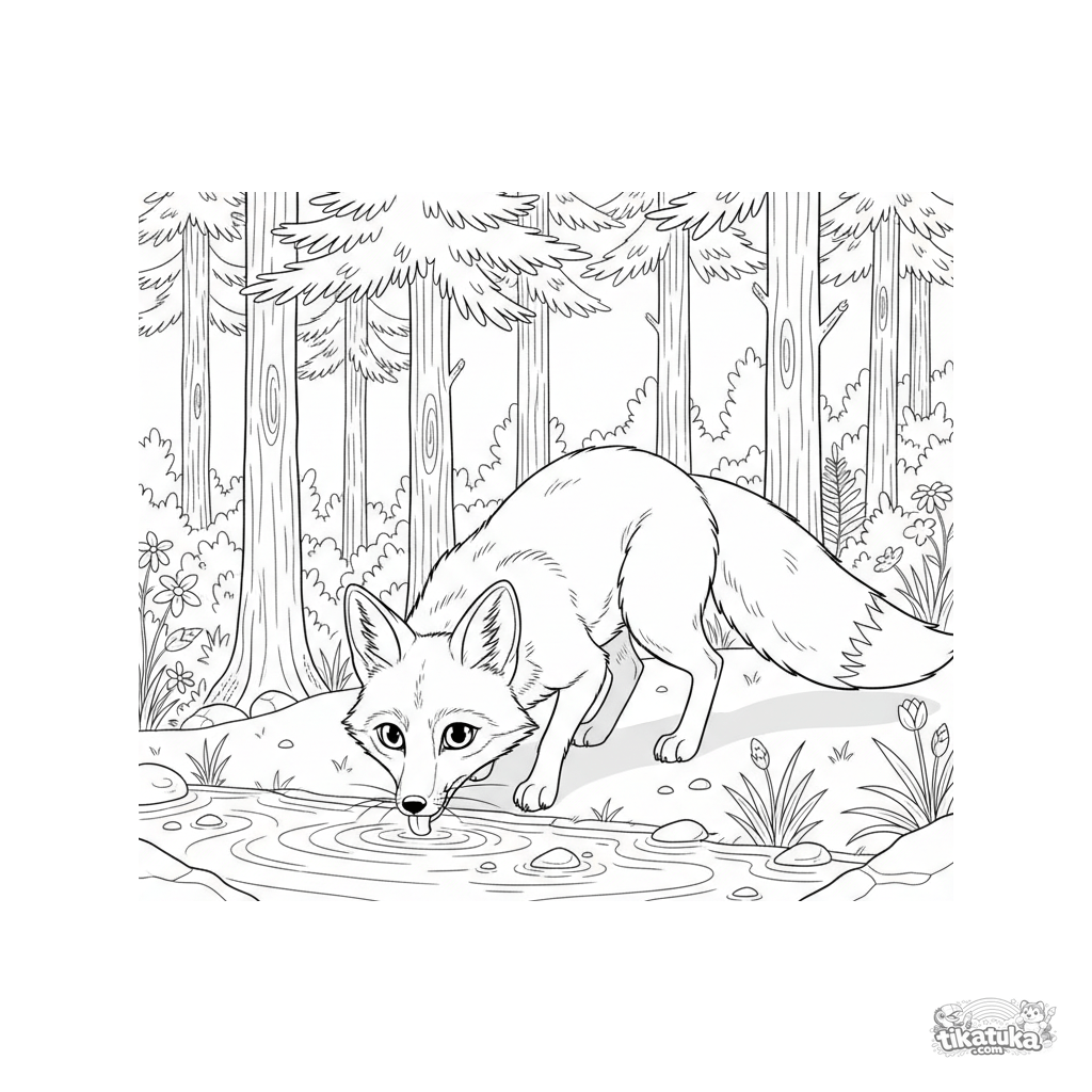 Detailliertes Ausmalbild für 10-12 Jahre: Ein Rotfuchs trinkt vorsichtig Wasser von einem Waldbach in der Dämmerung. Realistische Illustration eines Wildtieres in seinem Lebensraum.