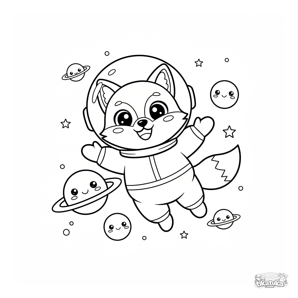 Weltraum-Ausmalbild: Astronaut Fuchs Foxy schwebt unter lächelnden Planeten. Plüschmaskottchen-Stil, einfache Formen.