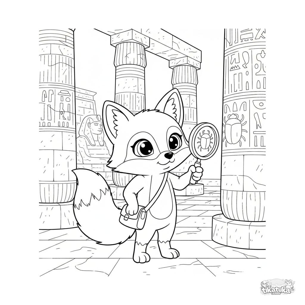 Ausmalbild für Kinder 4-6: Detektivfuchs Foxy erkundet einen alten ägyptischen Tempel mit Hieroglyphen. Einfache Holzspielzeug-Formen, breite Ränder zum Ausmalen.
