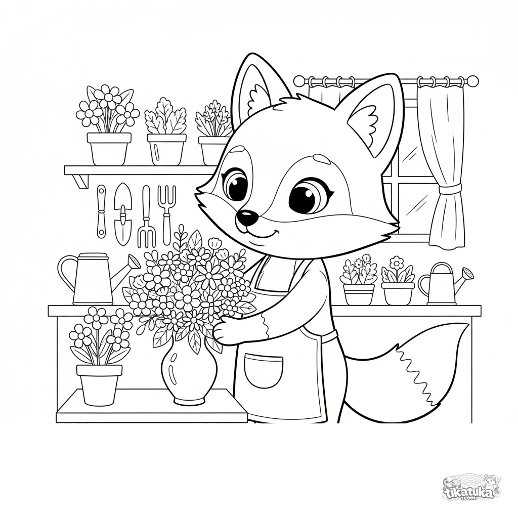Ausmalbild für Kinder 4-6. Fuchs Foxy arbeitet als Florist und stellt einen Strauß im Blumenladen zusammen. Weiche puppenartige Linien, viele Blumen, einfaches Interieur.