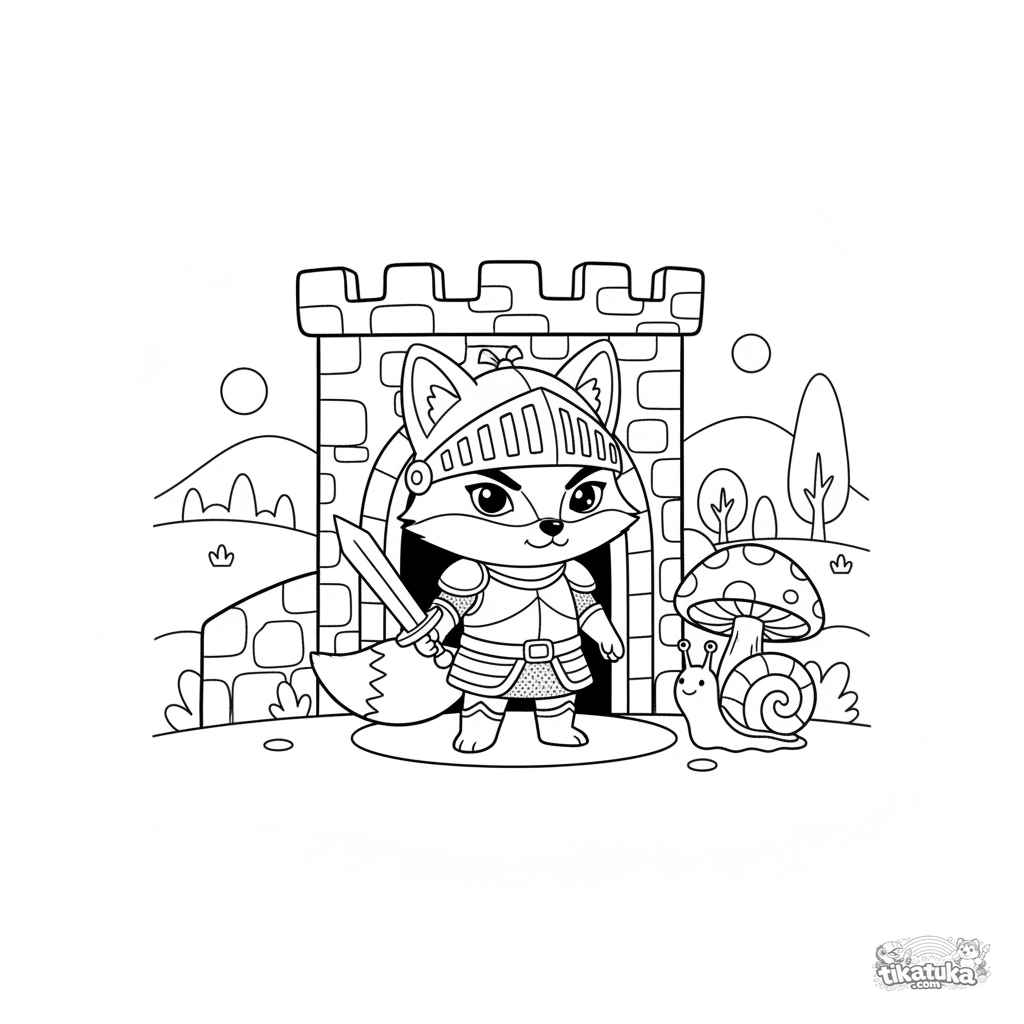 Ausmalbild für Jungen 4-8: Fuchs Foxy in Ritterrüstung bewacht das Tor einer Spielzeugburg. Einfache Formen und freundliche Szene.