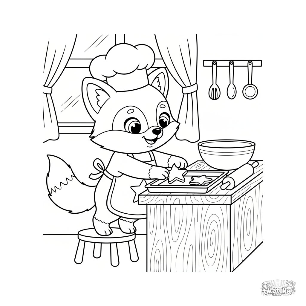 Ausmalbild für Kinder 4-6: Fuchs Foxy als Bäcker, der Kekse in einer gemütlichen Küche zubereitet. Weicher Plüschtier-Stil, einfache Details.