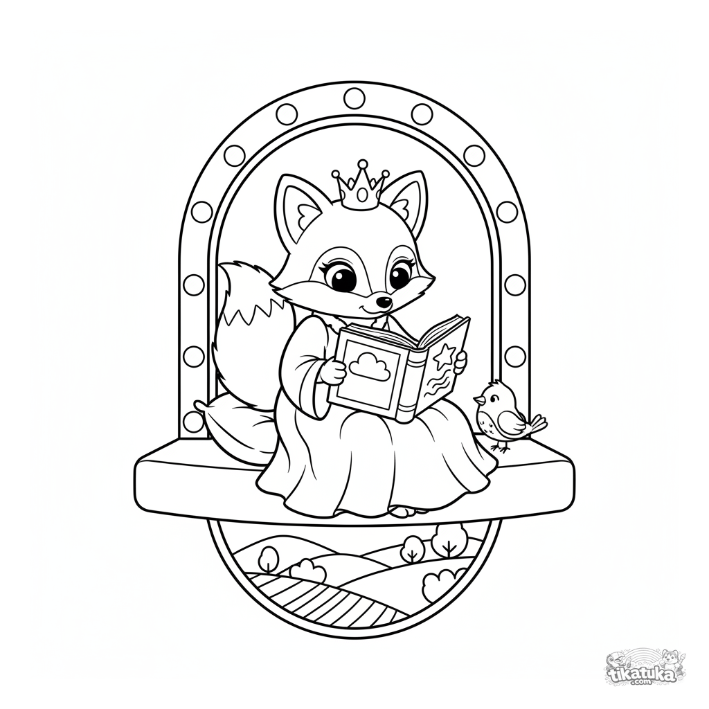 Ausmalbild für Mädchen: Fuchs-Prinzessin Foxy liest ein Buch in einem Schlossturm. Weicher Puppenstil, gemütliche Szene.