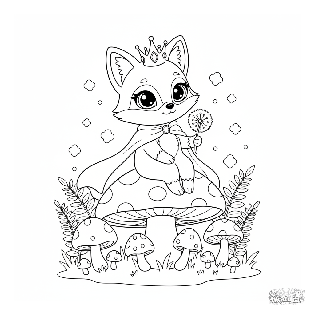 Ausmalbild mit der Fuchsprinzessin Foxy in einem magischen Pilzwald. Für Kinder von 4-6 Jahren. Die Prinzessin sitzt auf einem großen Fliegenpilz, umgeben von Farnen.
