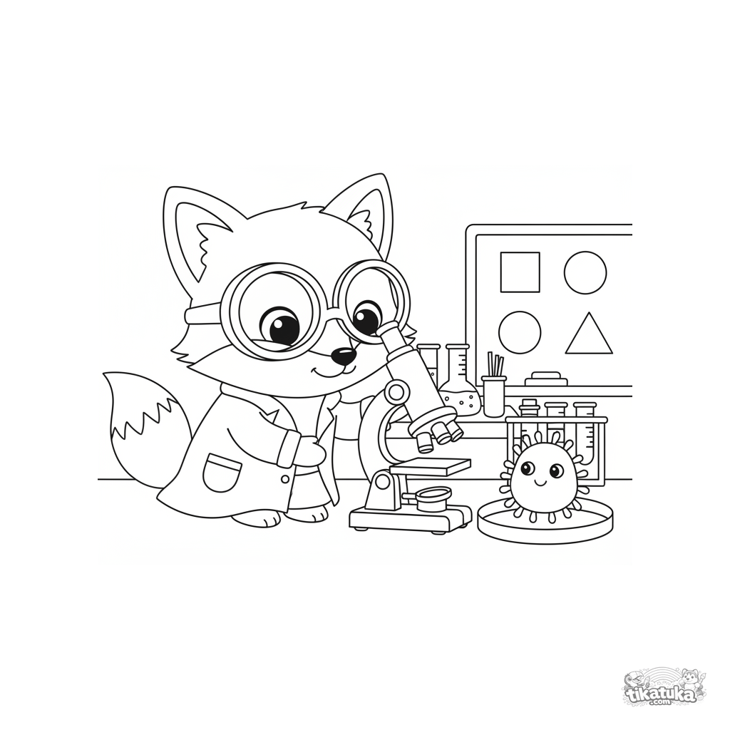 Kinder-Ausmalbild: Fuchs Foxy als Wissenschaftler, der eine freundliche Mikrobe im Labor untersucht. Weicher Puppenstil, lustige Details, einfache Wissenschaftswerkzeuge, breite Ränder.