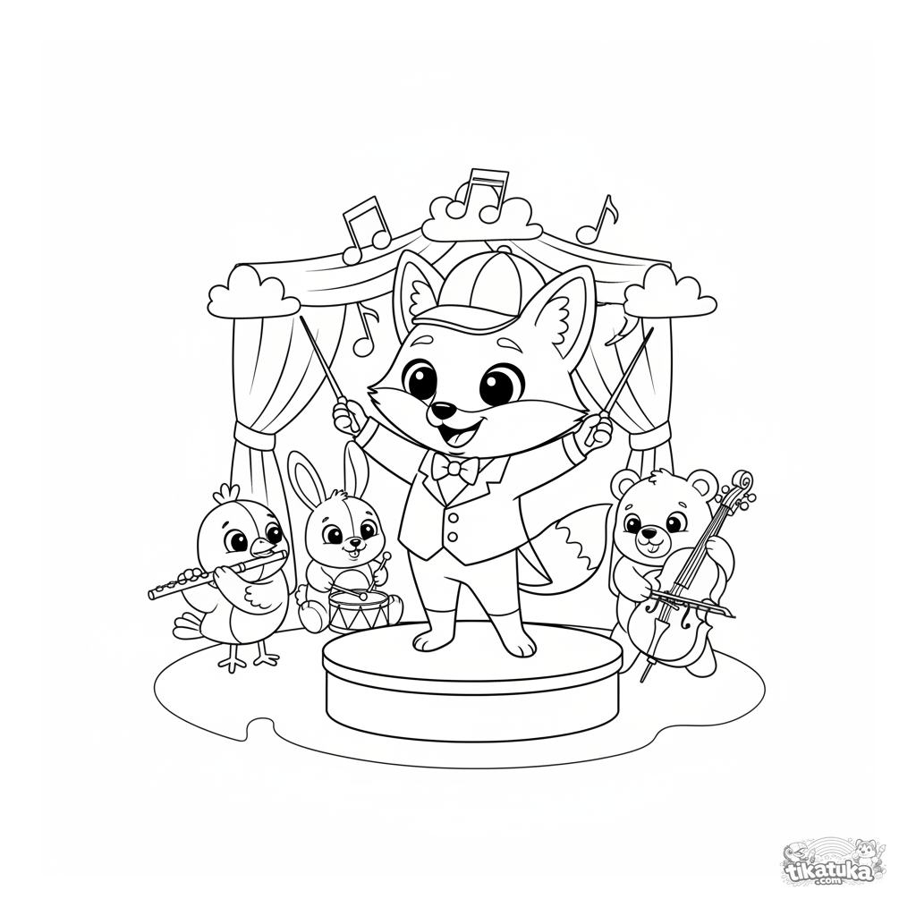 Ausmalbild für Kinder 4-6: Fuchs Foxy dirigiert ein kleines Spielzeugorchester aus Tierfreunden. Weicher Puppenstil, fröhliche Noten.