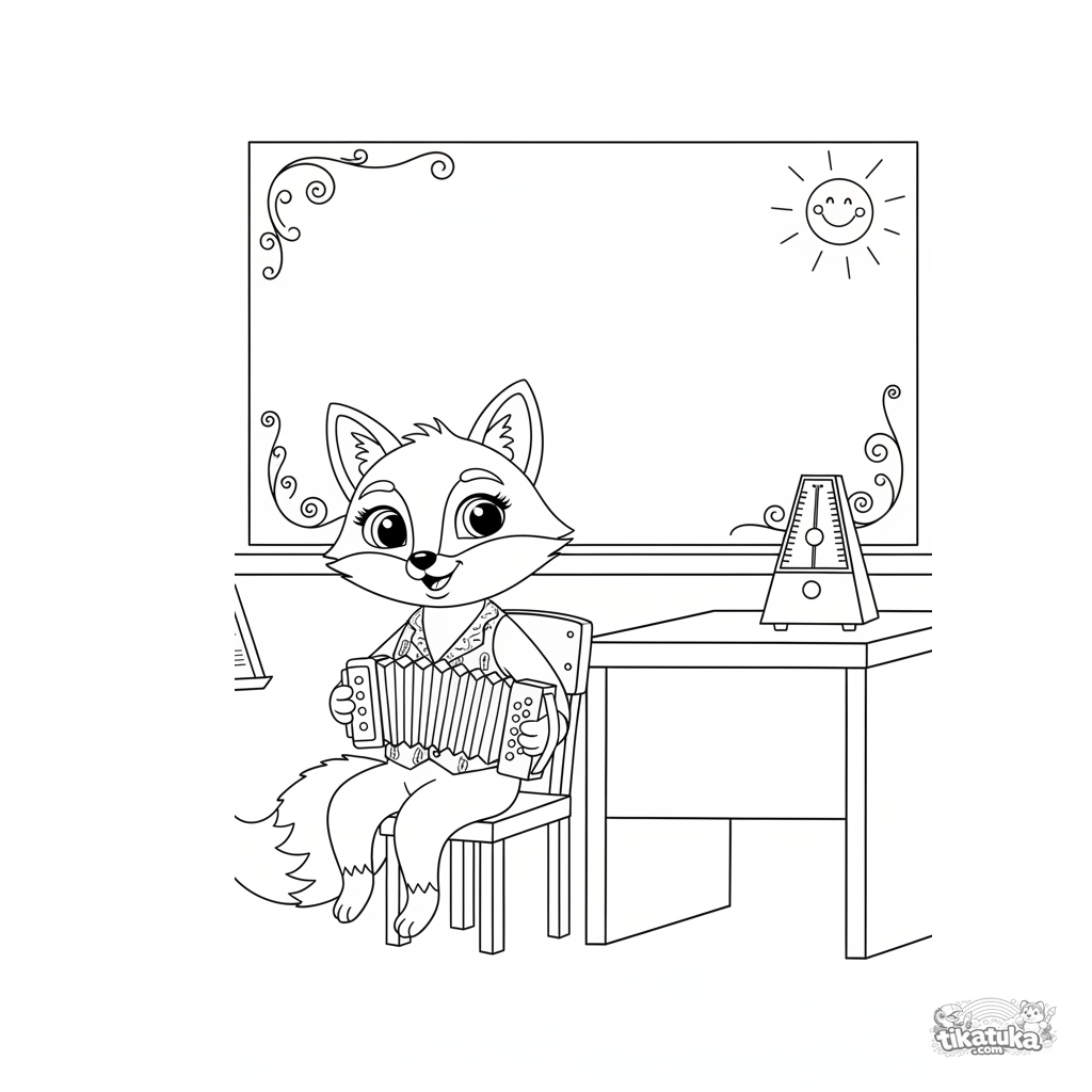 Ausmalbild für Kinder 7-9: ein Fuchs-Musiker in einer Weste spielt Akkordeon im Klassenzimmer an der Tafel. Notenblatt auf einem Ständer und ein Metronom in der Nähe.