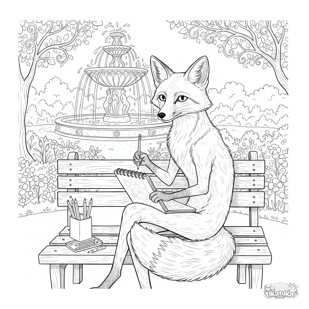 Ausmalbild für ältere Kinder 10-12: Ein künstlerischer Fuchs sitzt auf einer Steinbank und skizziert einen entfernten Parkbrunnen. Lockerer Skizzenstil, detaillierte Szene.